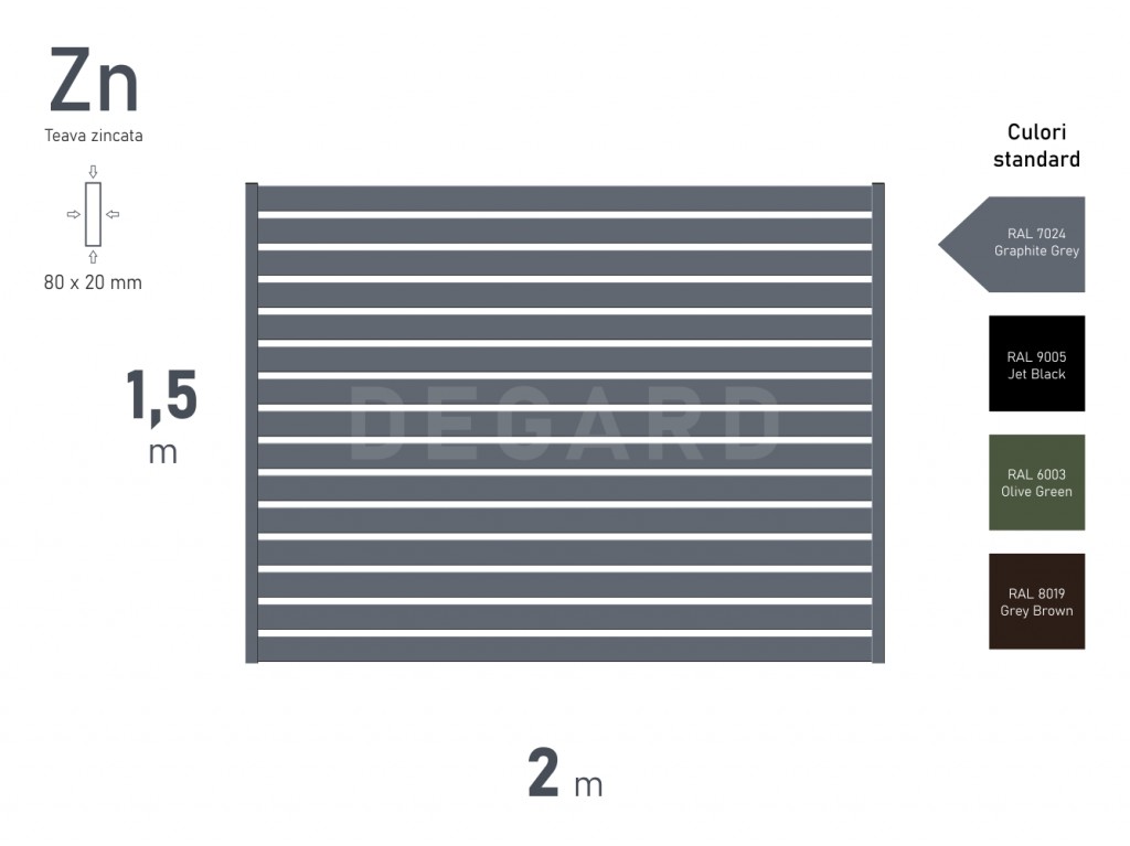 Construcția este realizată din țeavă profilată zincată, ceea ce asigură o rezistență ridicată și o bună protecție împotriva factorilor externi. Geometria bine gândită a lamelelor nu doar creează un aspect ordonat și elegant, ci contribuie și la creșterea nivelului de intimitate și securitate, protejând spațiul de priviri nedorite.