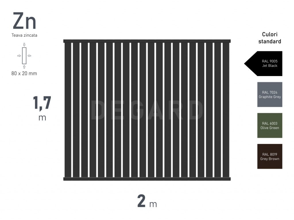 Construcția este realizată din țeavă profilată zincată, ceea ce garantează o rezistență ridicată și o excelentă protecție împotriva coroziunii. Lamelele verticale din profil 80×20 mm creează un ritm vizual expresiv și asigură un echilibru între intimitate și lejeritate vizuală, iar elementele orizontale ranforsate de 40×40 mm conferă rigiditate și stabilitate întregii structuri.