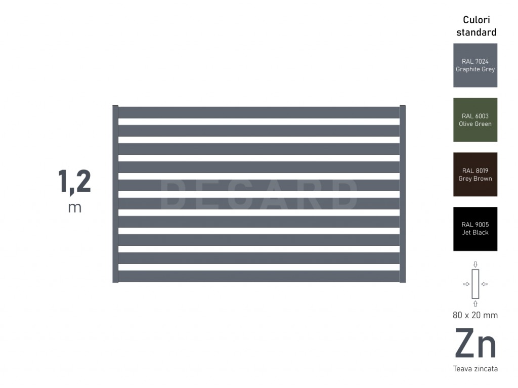 Construcția este realizată din țeavă profilată zincată, ceea ce asigură o rezistență ridicată și o bună protecție împotriva factorilor externi. Geometria bine gândită a lamelelor nu doar creează un aspect ordonat și elegant, ci contribuie și la creșterea nivelului de intimitate și securitate, protejând spațiul de priviri nedorite.