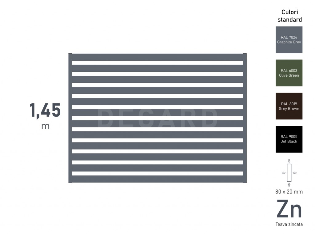 Construcția este realizată din țeavă profilată zincată, ceea ce asigură o rezistență ridicată și o bună protecție împotriva factorilor externi. Geometria bine gândită a lamelelor nu doar creează un aspect ordonat și elegant, ci contribuie și la creșterea nivelului de intimitate și securitate, protejând spațiul de priviri nedorite.