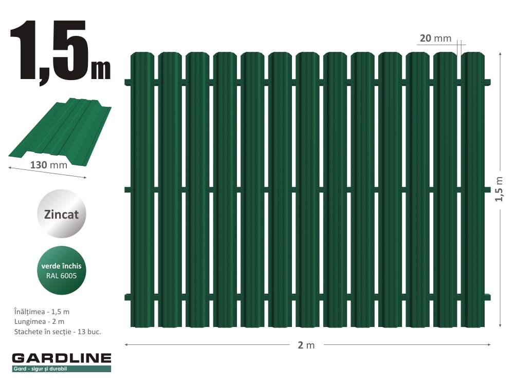 Gard din ștachet metalic zincat. Н-1,5m L-2m. S130x13 RAL6005