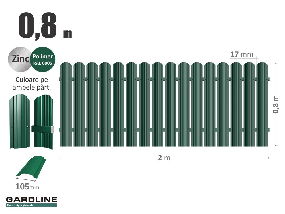 Gard din ștachet metalic zincat. Н-0,8m L-2m. S105x16 RAL6005