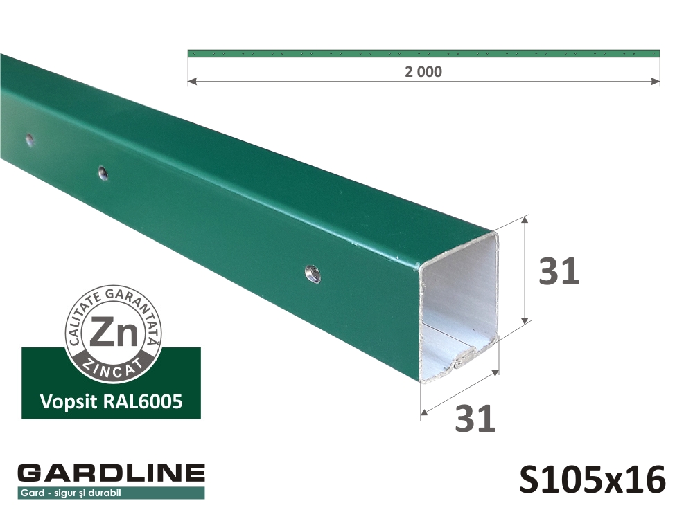 Țeava zincată 31x31 cu găuri L-2m pentru ștachet metalic S105x16 RAL 6005