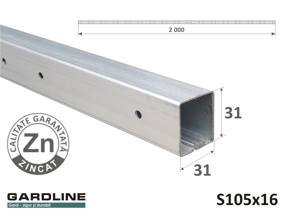 Țeava zincată 31x31 cu găuri L-2m pentru ștachet metalic S105x16