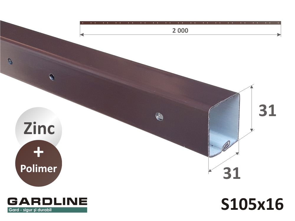 Țeava zincată 31x31 cu găuri L-2m pentru ștachet metalic S105x16 RAL 8017